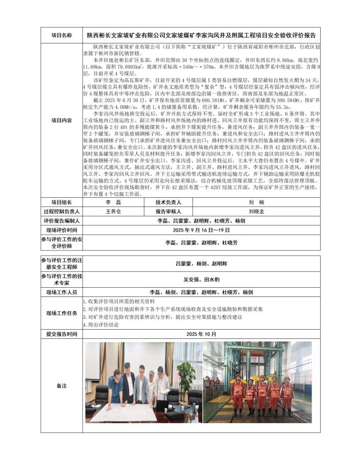 陕西彬长文家坡矿业有限公司文家坡煤矿李家沟风井及附属工程项目安全验收评价报告