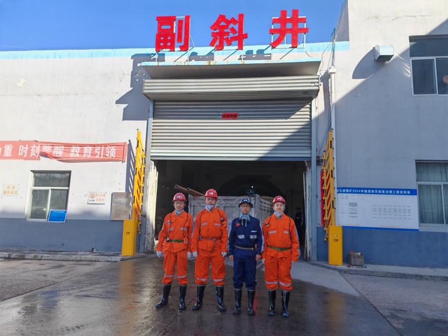 矿井采用斜井多水平开拓。地面工业场地共布置3条井筒,主斜井井筒装备带式输送机担负矿井的原煤提升任务,兼进风及安全出口;副斜井井筒运行无轨胶轮车担负矿井的辅助提升任务,兼进风及安全出口;回风斜井为矿井专用回风井,兼安全出口。全井田共划分为两个开采水平,一水平开采2-2、3-3、4-3煤层,主水平设在3-3煤层中,水平标高+1155m,二水平设在5-2煤层中,开采5-2煤层,水平标高+1060m。井下在3-3煤层中沿南北方向布置一水平主运、辅运和回风三条大巷,在4-3煤层中沿南北方向布置辅助水平主运、辅运和回风三条大巷。全井田共划分为6个盘区,2-2和3-3煤层各自划分为1个盘区,4-3和5-2煤层以大巷为界划分为2个盘区,西部为一盘区,东部为二盘区。煤层间采用下行开采顺序,一水平2-2、3-3煤层已开采完毕,开采4-3煤层和5-2煤层时,开采顺序为先采一盘区,再采二盘区,目前开采一水平4-3煤层一盘区。矿井采用中央并列式通风方式,抽出式通风方法,主、副斜井进风,回风斜井回风。井下主运输采用带式输送机连续运输方式,辅助运输采用防爆无轨胶轮车直达运输方式。井下采煤工作面采用走向长壁一次采全高综合机械化采煤法,全部垮落法管理顶板。现场勘查时,井下装备1个综采工作面和2个综掘工作面达到矿井设计生产能力。截止2024年12月31日,矿井保有资源储量30.943Mt,剩余可采储量11.214Mt,按矿井设计生产能力0.90Mt/a,考虑1.3的储量备用系数计算,矿井剩余服务年限9.6a。